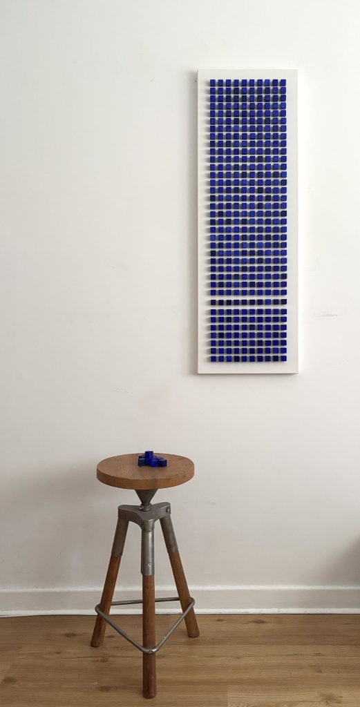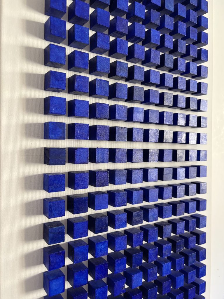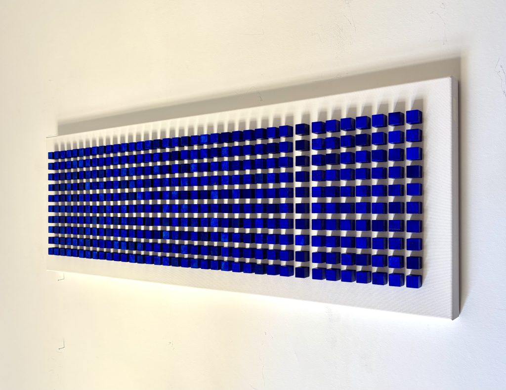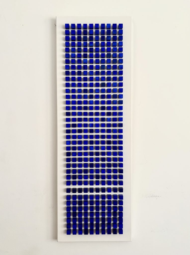 „Tiefen-blau“ 40 x 120 x 3,8 cm, Material: Holz, Acrylfarbe auf Baumwollgewebe, auf der Rückseite handsigniert, Endpreis EUR 780.