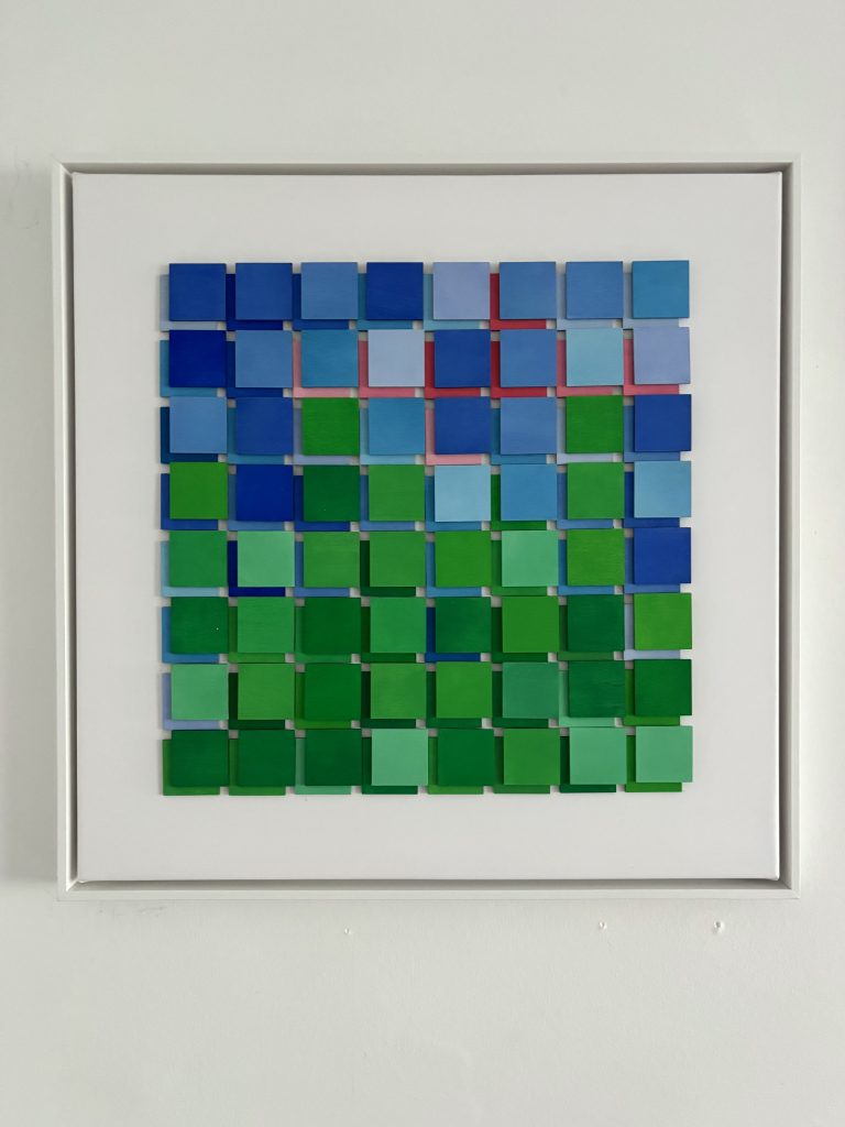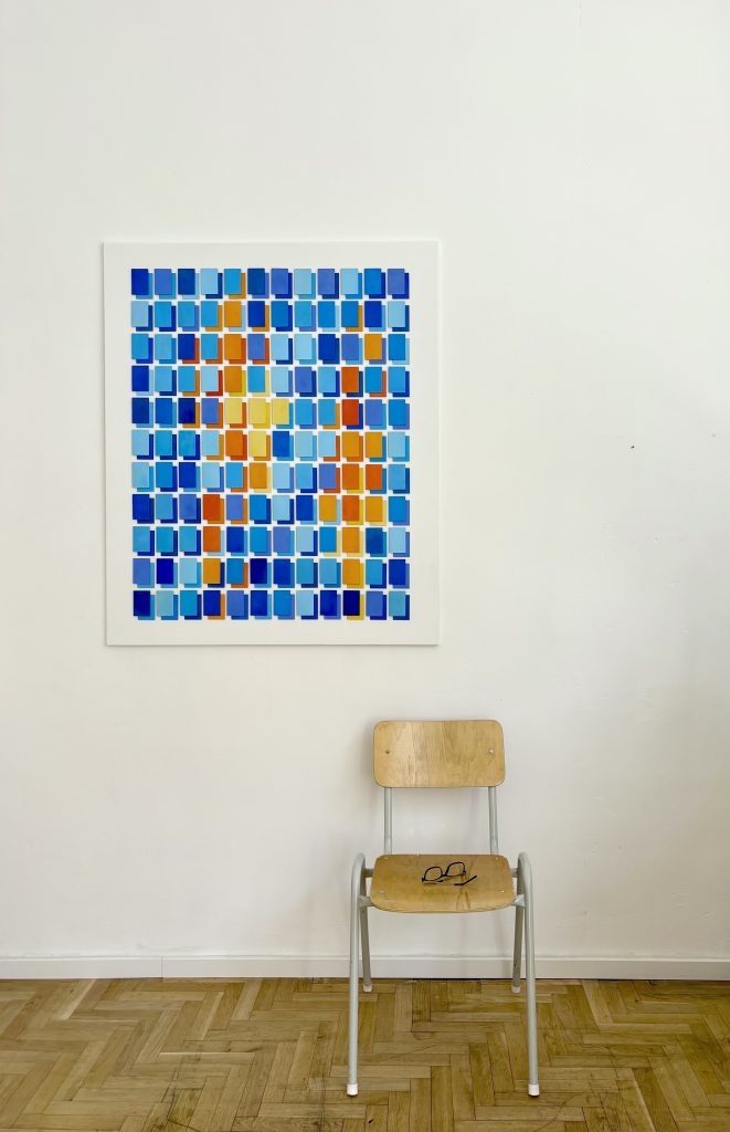 „Farbblock(ing)“ 100 x 100 x 4,5 cm, Material: Holz, Acrylfarbe auf Baumwollgewebe, auf der Rückseite handsigniert, Endpreis EUR 890.