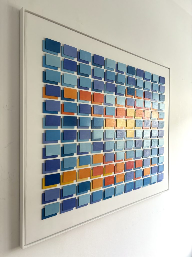 „Sonne im Meer“, 120 x 100 x 1,8 cm“, Material: Holz, Arcylfarbe auf Polyestergewebe im Rahmen, auf der Rückseite handsigniert, Endpreise EUR 980,00.