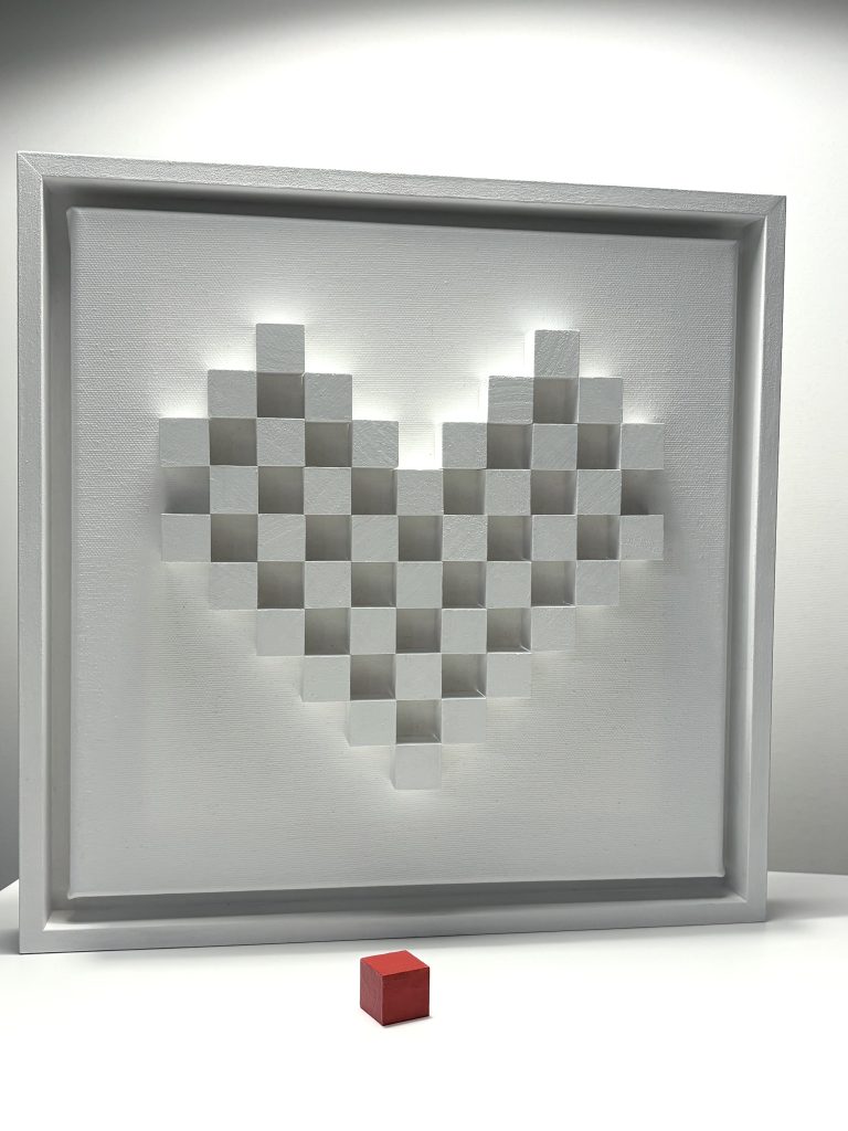 „Valentin – Herz ist Trumpf“, 30 x 30 x 1,9 cm, Material Holz, Acrylfarbe auf Baumwollgewebe im Rahmen, auf der Rückseite handsigniert, Endpreis EUR 230,00.